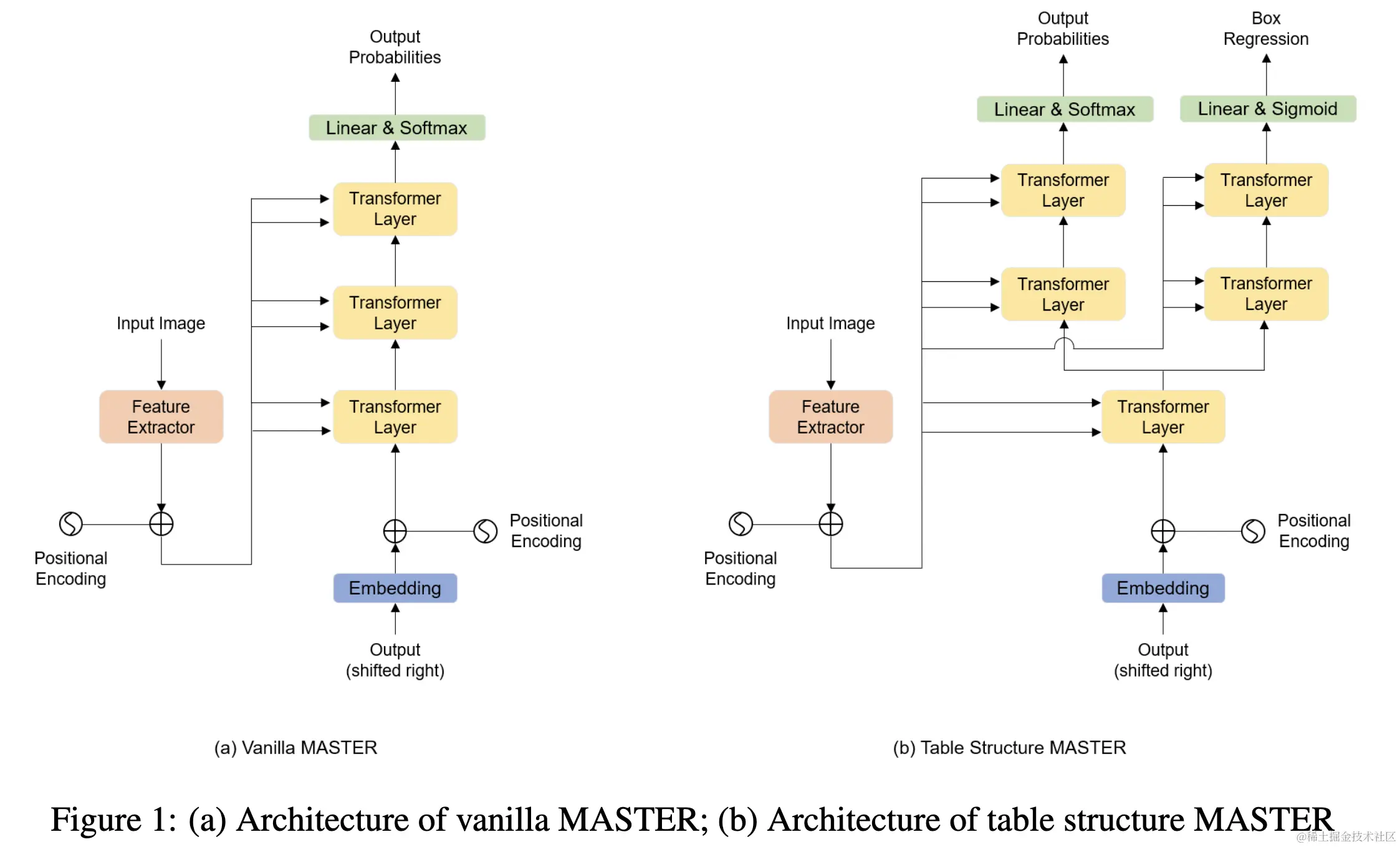 Ye Jiaquan[22]在TableMaster中通过改进基于Transformer的Master文字算法来得到表格结构输出模型。此外,还添加了一个分支进行框的坐标回归,作者并没有在最后一层将模型拆分为两个分支,而是在第一个 Transformer 解码层之后就将序列预测和框回归解耦为两个分支。其网络结构和原始Master网络的对比如下图所示: