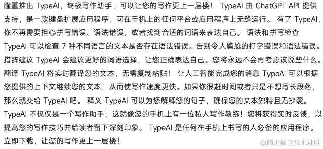 作为一款2023年5月30日才上线的年轻AI写作应用(与ChatGPT同日上架),【TypeAI - AI Keyboard Extension】无论是从应用标题、商店简介、商店五图展示,都展示出了满满的功能属性。即输入法拓展、无需复制切换页面、快捷智能的AI写作插件。