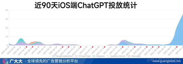 根据广大大-广告主分析功能可知,尽管【ChatGPT】早在2023年5月就已上线AppStore,但从广告投放来看始终还是一个比较谨慎、保守的宣传策略。数据显示,【ChatGPT】近90天iOS端总计投放素材仅有98条。