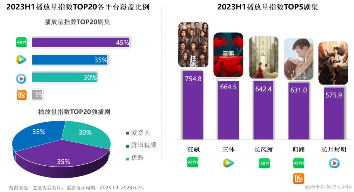 总体上,艺恩数据《2023H1国产剧市场及趋势研究报告》显示,爱奇艺贡献了2023上半年播放量指数TOP20剧集中的近一半,这在国内四大主流视频流媒体平台中稳居第一——TOP20中35%为爱奇艺独播,强化了用户对平台的心智记忆。
