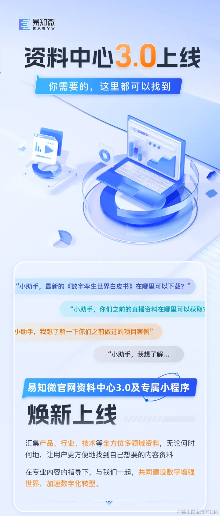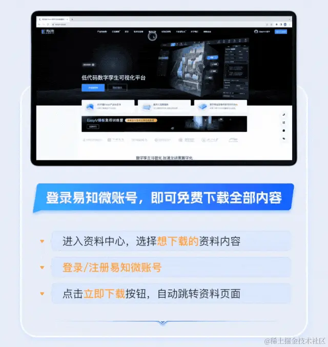 易知微资料中心3.0上线|你需要的,这里都可以找到 易知微EasyV数字孪生可视化 2023-09-01 46 阅读1分钟 点我一下即可进入资料中心! 以下优质资料下载欢迎前往: easyv.cloud/references/… 更多行业案例查看&素材免费试用: easyv.cloud/?t=juejin