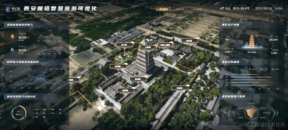 该组件不仅能捕捉地表地貌、建筑物等目标的三维信息,为大规模建模打下基础;还支持以散点、飞线、路径、区域等多种可视化形式展示倾斜摄影数据,助力多样化可视化展示;同时与常规的2D组件进行联动,实现3D场景与2D看板的交互,使用户能够更深入地探索数据。