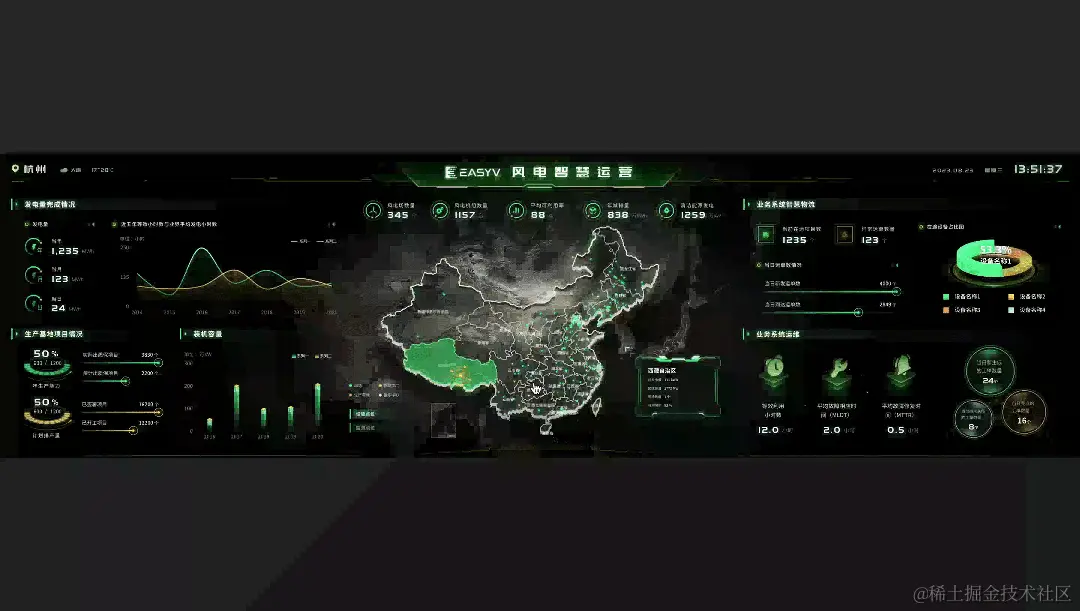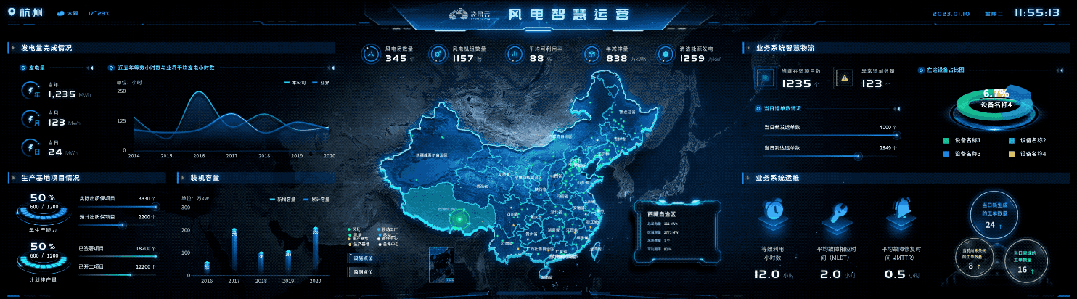 **业务价值:**该模板立足风电场,统计展示发电量完成情况、装机容量、业务系统运维效率等指标,结合平面地图,支持对不同地域的风电运营进行综合展示。