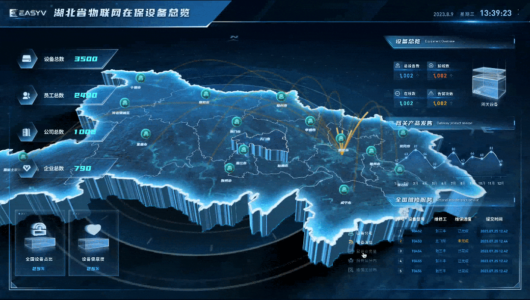 该模板针使用3D地图,对湖北省设备分布、各区设备发售、业务量及维修进行可视化展现,同时对设备进行总览,实现全省下物联网设备的综合管理。