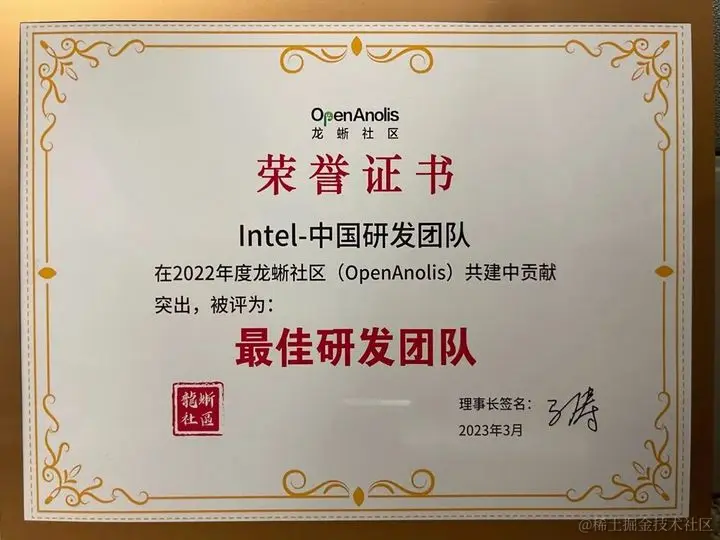 (图/Intel 获“龙蜥社区 2022 年度最佳研发团队”奖)