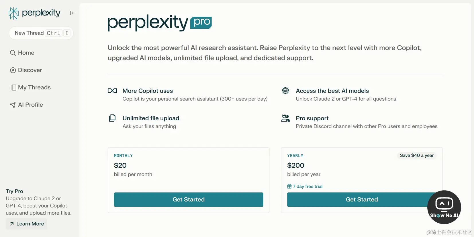 Perplexity Pro 是付费升级版本,每月 $20 就可以解锁 GPT-4、Claude-2 等顶尖的AI大模型,并且获得每天 300 多次的 Copilot 使用权限等