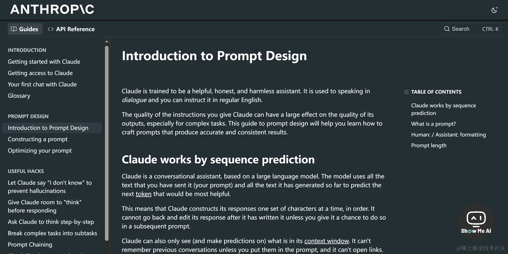 Claude 官方 Guide 文档很不错啊!三个部分「提示设计 (Prompt DESIGN)」「有用的提示技巧 (USEFUL HACKS)」「用例 (USE CASES)」非常详细系统地介绍了提示词的构建与优化、写作技巧和实用案例。