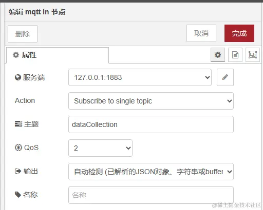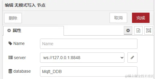 - 点击节点,进行参数设置。在 Mqtt In 节点中设置服务端和消息主题,在无模式写入节点中设置数据库名称。