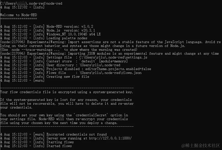 node-red以开启 Node-RED 服务。出现以下内容表示 Node-RED 服务启动成功。