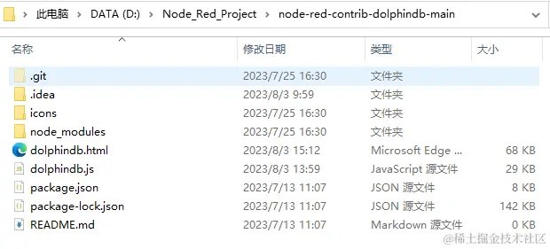 node-red-contrib-dolphindb-main安装包。例如在下例中,下载并解压至 D:\Node_Red_Project 文件夹下,文件里的内容如下: