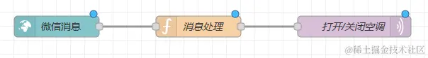 举个例子,人们会希望在回家的路上就能开启空调,到家即享清凉。借助 Node-RED 可以轻松实现这个需求。通过简单地拖拽微信节点、消息处理节点和空调控制节点,然后连接设置它们,就能实现这个流程。这样,只需在微信上发送一条消息,就能控制家中空调的开关。