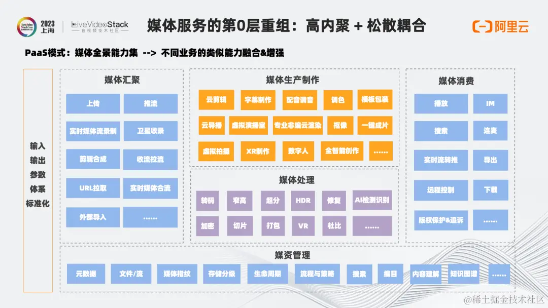 将PaaS层5个板块进行服务的细粒度拆分,各项能力进一步内聚和丰富,形成媒体全景能力集,详见上图,列举了一些媒体服务的典型能力。
