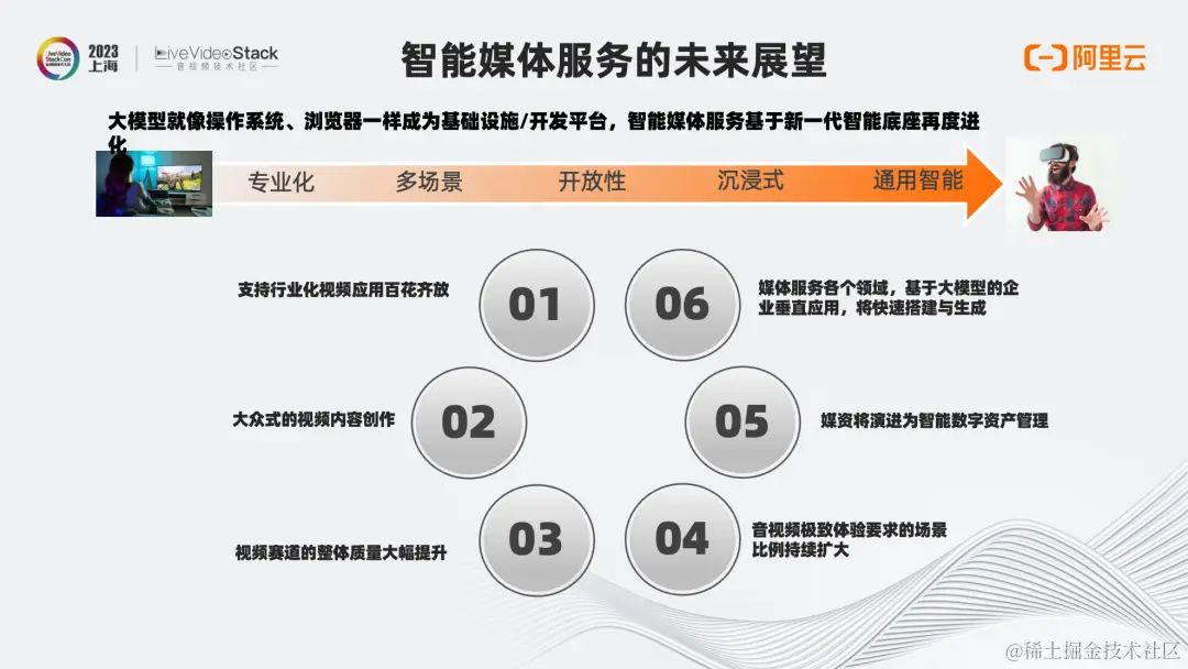 关于智能媒体服务的未来展望,基于当下大模型的发展趋势,我们认为基础大模型将像操作系统、浏览器一样成为AI基础设施与开发平台底座,智能媒体服务也会基于新一代智能底座围绕专业化、多场景、开放性、沉浸式和通用智能再度进化: