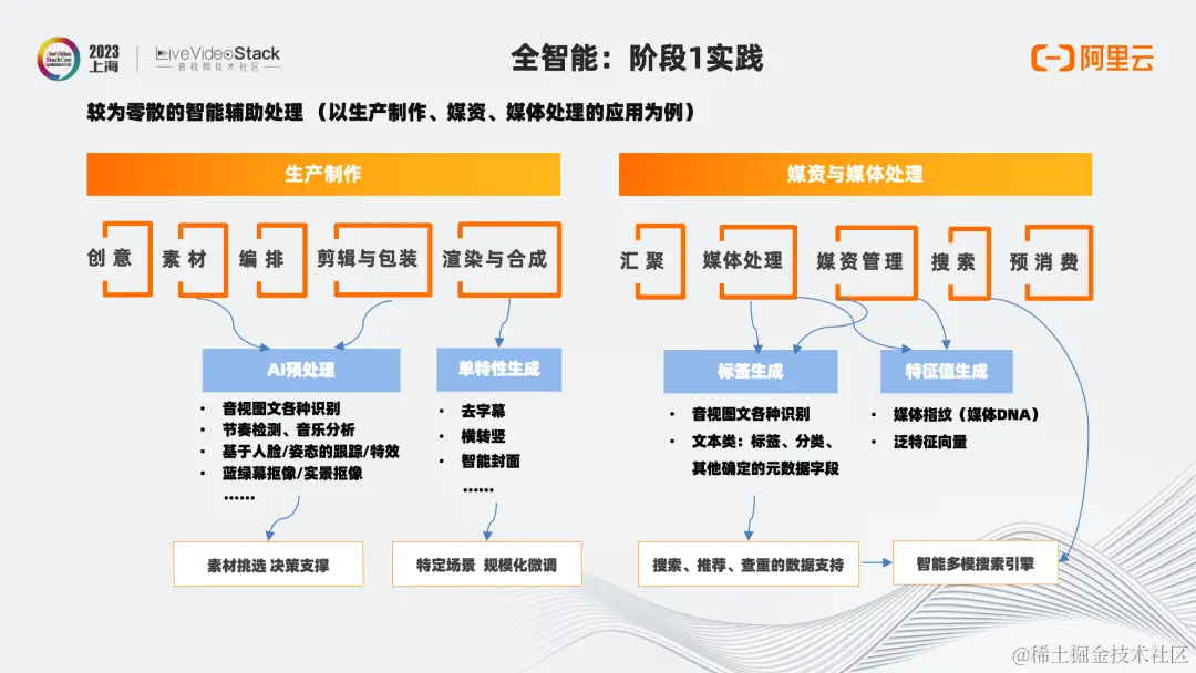 在媒资与媒体处理的环节中,AI主要针对视频进行单一维度的内容理解,生成一些标签和特征值作为下一步骤的数据支持,人的参与至关重要,也难以进行全流程的规模化。