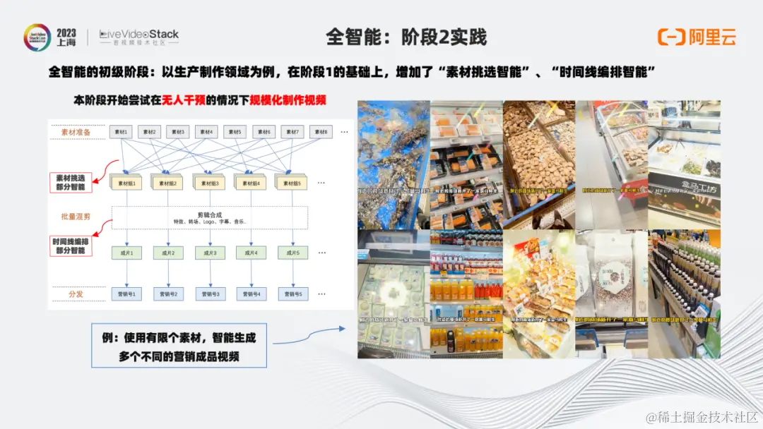 在这个阶段我们尝试在无人干预的情况下规模化制作视频,将原始素材通过画面分析和AI预处理加工为中间片段,使用美学、丰富度优先等多种策略进行素材挑选,并参考短视频模板规则进行时间线的部分智能生成,最终实现利用有限素材,智能生成多个不同的营销成品视频。