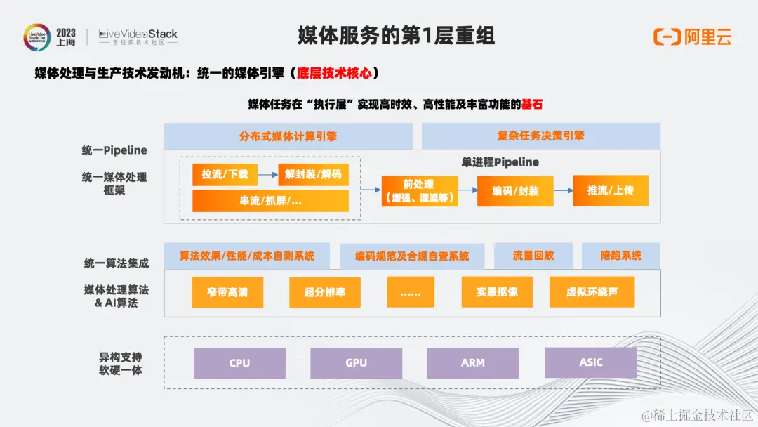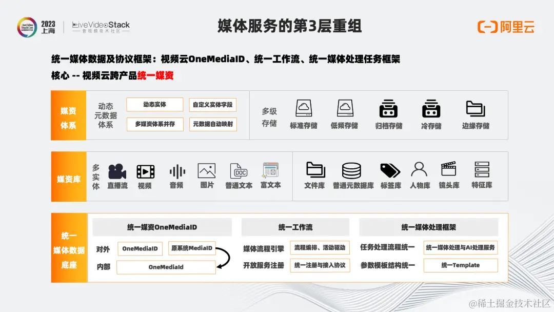 最底层是统一媒资的数据底座,1)对直播、点播等不同服务的媒体信息构建OneMediaID,2)通过媒体流程引擎和开放服务注册构建统一工作流,3)通过统一任务处理流程、管道定义、参数模板构建统一媒体处理协议框架。