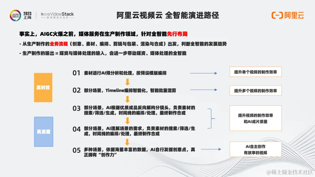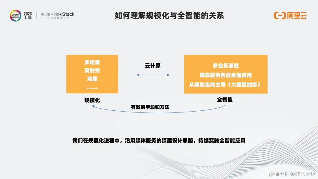 “规模化”和“全智能”看似无关,实际在云计算场景下它们关联密切,规模化全场景意味着AI对多业务的渗透,而AI的加入对媒体业务的时效性有较大提升,AI+云计算则令海量的视频智能处理成为可能。总体来看,**全智能是实现规模化有效的手段和方法,并且随着大模型技术的发展,以前AI最被诟病的效果问题也有了相当的改善,媒体处理与生产的质量得到显著提升。**我们在规模化进程中也会沿用媒体服务的顶层设计思路,持续实践全智能应用。