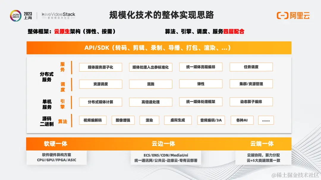 首先,我们采用了云原生架构作为整体实现框架,利用云的先天优势做好弹性和按需处理,并且在视频云的IaaS层实现软硬一体、云边一体和云端一体。其次,媒体服务规模化技术的实现依赖算法、引擎、调度、分布式服务四层的相互配合,缺一不可。