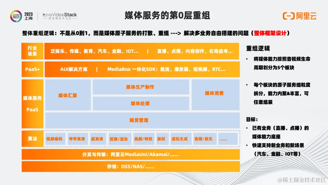 本次分享分为以上四部分,一是媒体服务(Mediaservices)面临的技术难题;二是如何使用统一“顶设”进行媒体服务的架构重组与规划设计;三是阿里云视频云服务不同企业客户不同场景需求面临的技术挑战、解法以及关于智能化演进的思路和实践;四是关于智能媒体服务的未来展望。