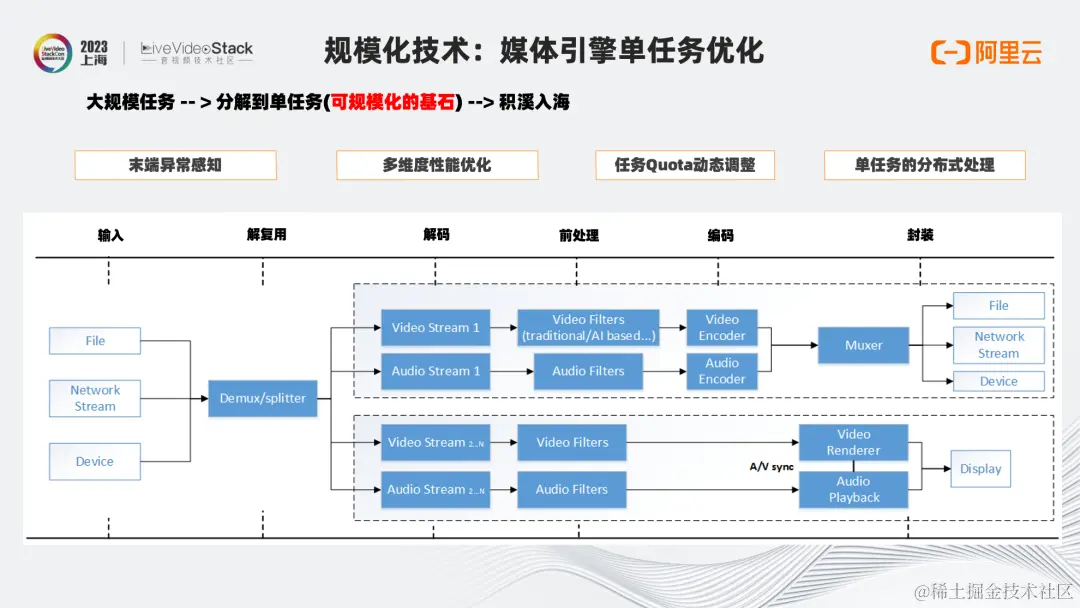 我们通过末端异常感知(稳定性优化)、多维度性能优化(利用算法工程优化、指令集优化、硬件加速优化和结合业务策略优化来优化单帧处理时间,进一步降低成本)、任务Quota动态调整(调度层依据引擎层动态反馈最优调整资源池配置,以节约成本)和单任务的分布式处理(将复杂任务拆分处理)实现单任务优化。