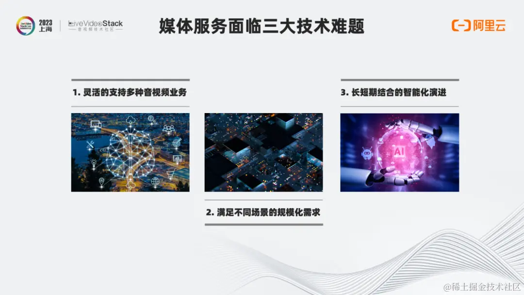 媒体服务当前面临的技术难题可以总结为三大类:一是如何灵活支持不同行业、市场、客户、场景的音视频业务;二是如何在此基础上满足这些迥异的业务场景的规模化需求;三是随着AIGC的兴起,在将AI技术融入媒体服务迭代的过程中,如何平衡短期利益和长期技术方向,做好长短期结合的智能化演进。