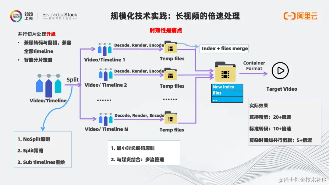在长视频的转码与剪辑处理中,时效性无疑是最大的痛点,尤其是当客户的行业是新闻资讯等需要快速分发的场景时,则显得更加重要。与我们上个版本的的高倍速并行处理技术相比,最新版本增加了三个特性:1)高倍速并行框架既支持单入多出的转码场景,也支持输入为多轨道/素材/效果编排的时间线的剪辑场景;2)无论时间线(timeline)的格式如何,我们均支持在任意位置split,精度到帧级别;3)不依赖客户的主动配置,智能判断timeline是否适合分片以及如何分片能拿到最高的收益。