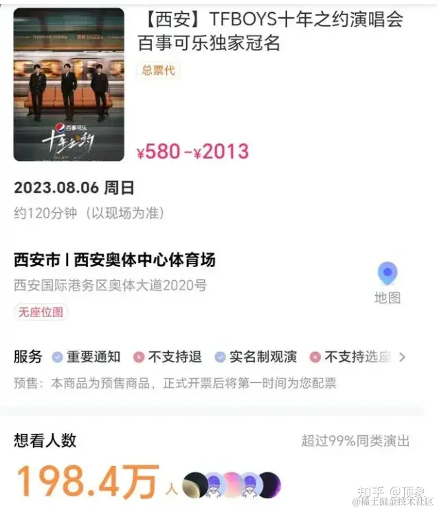 类似的情况也出现在TFBOYS十周年西安演唱会上,超过520万人想参加这场演唱会,门票在开售后立即售罄。由于不支持自主选座、要求实名制入场,执行观演人一票一证规定。验票时将对入场观演人的人脸、证件、座位及纸制门票的观演人信息进行比对,全部信息确认一致后方可入场。并且所购门票不支持转赠与转售。
