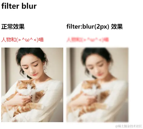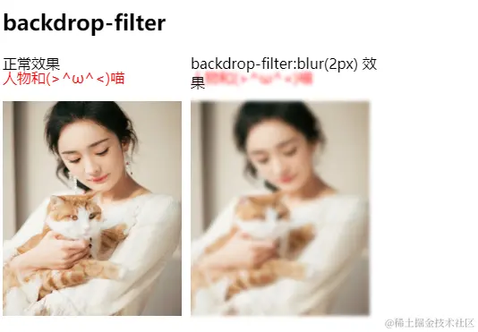 filter 属性可以直接实现当前元素模糊,同样也是设置 blur(2px), 直接在文字和图片的父级 div 上设置 filter:blur(2px) 属性,直接在元素上设置模糊效果和 backgrop-filter 属性效果一致,只是使用场景不一样