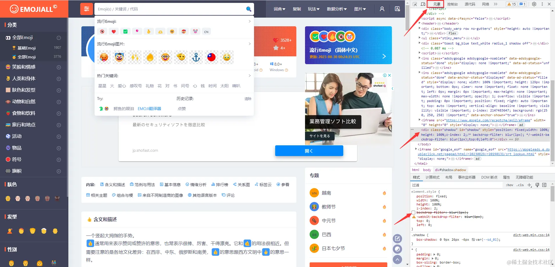 在一个资源网站发现一个弹框效果,如下图,点击搜索框后,网站整个内容模糊了,只有弹框区内容是清晰的,看起来弹框区的元素更突出显眼一点,移动端这种类似模糊效果很常见,在PC端的网站,我日常逛的一些网站似乎没见过这样做模糊效果,虽然这种背景模糊只是前端的一个小效果,但是用起来的时候给我一种眼前一亮的感觉,这个网站的产品设计是走了心的 👍👍,接下来我们就顺藤摸瓜,分析一下 Ta 的模糊实现