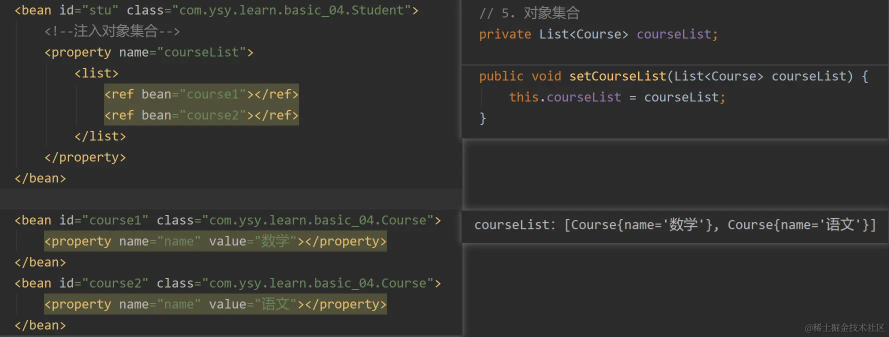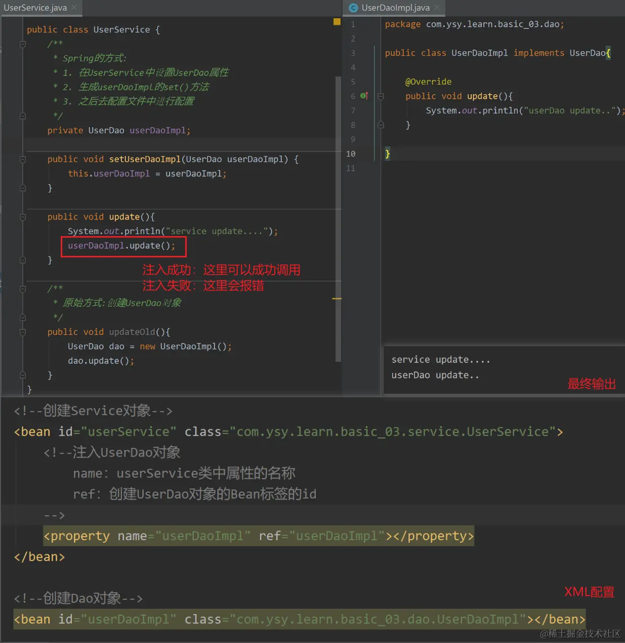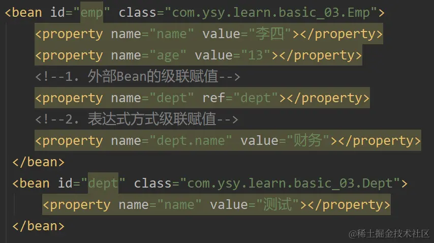- 为Bean的属性设置值和对其他Bean引用(调用set()方法)