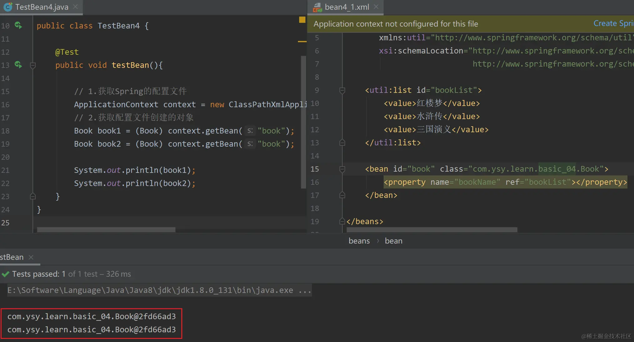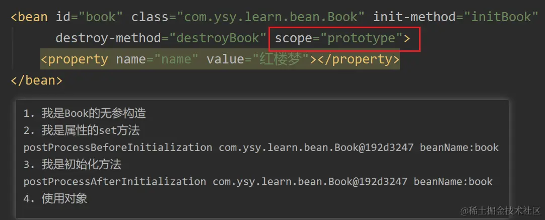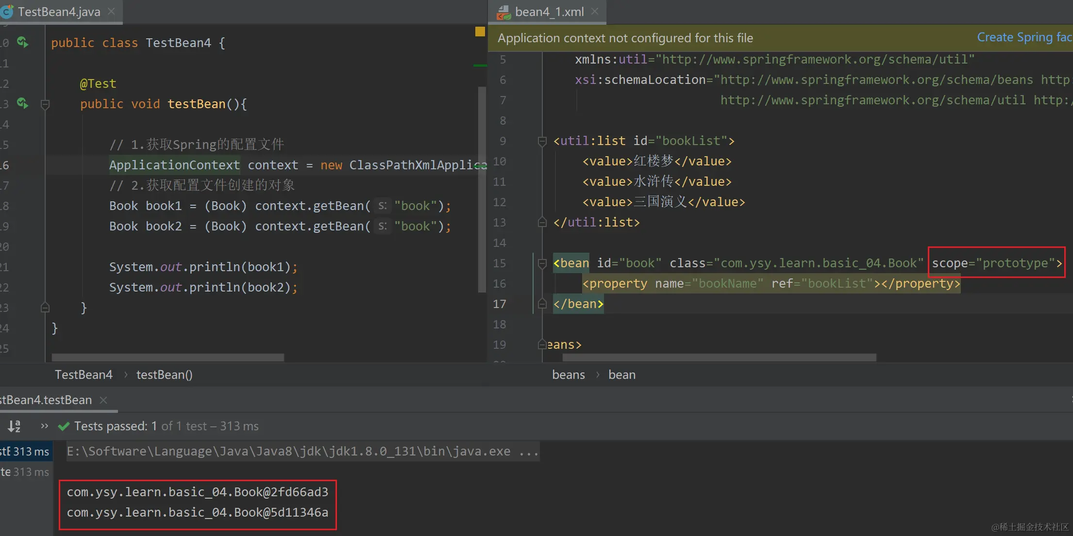 在XML配置文件中指定Bean的作用域为Prototype,之后在testBean()中两次获取book对象,打印对象地址,两次获取对象的地址不一致,说明两次获取的不是同一个对象实例。