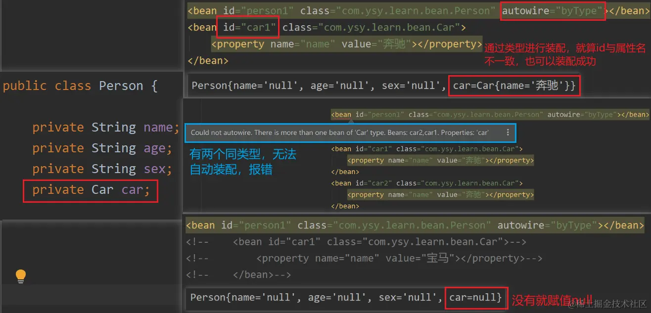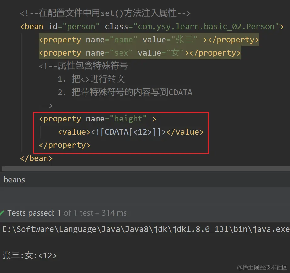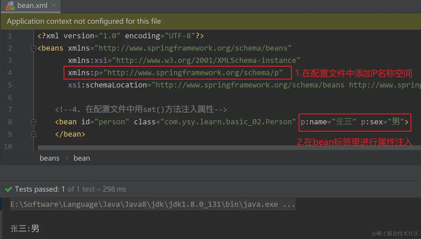 <property>是根据set方法来确定属性名的,如果将setName()改成setPname(),Spring默认得到的属性名就是pname,而不是name