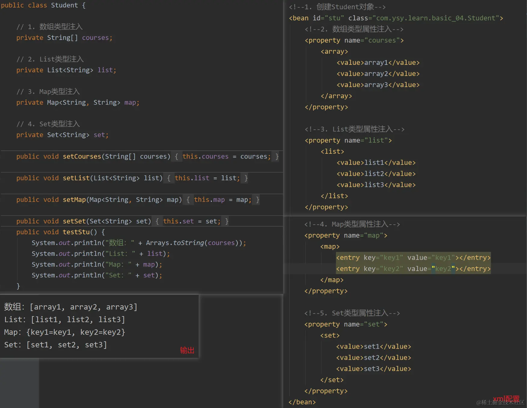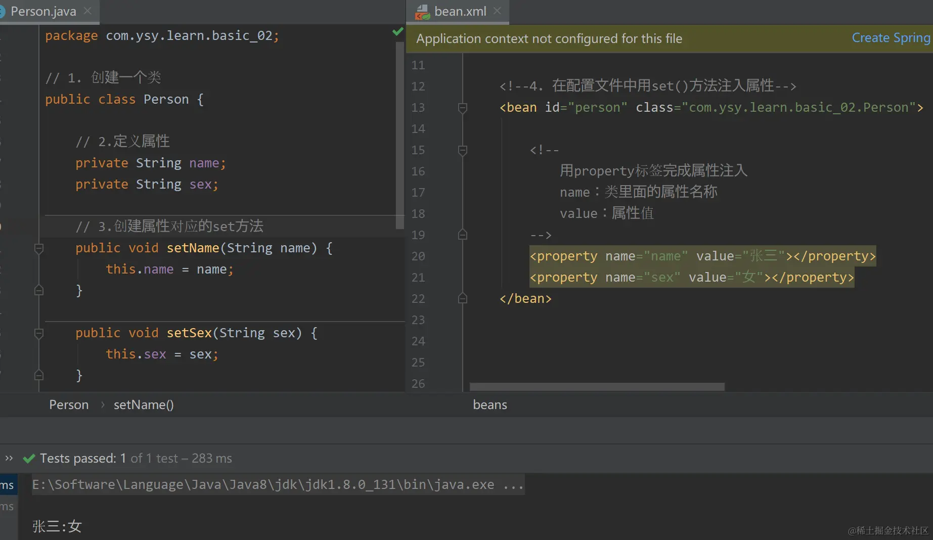 Spring提供了两种基于XML配置文件方式注入属性的方法,一种是属性的set()方法,一种是有参构造函数。