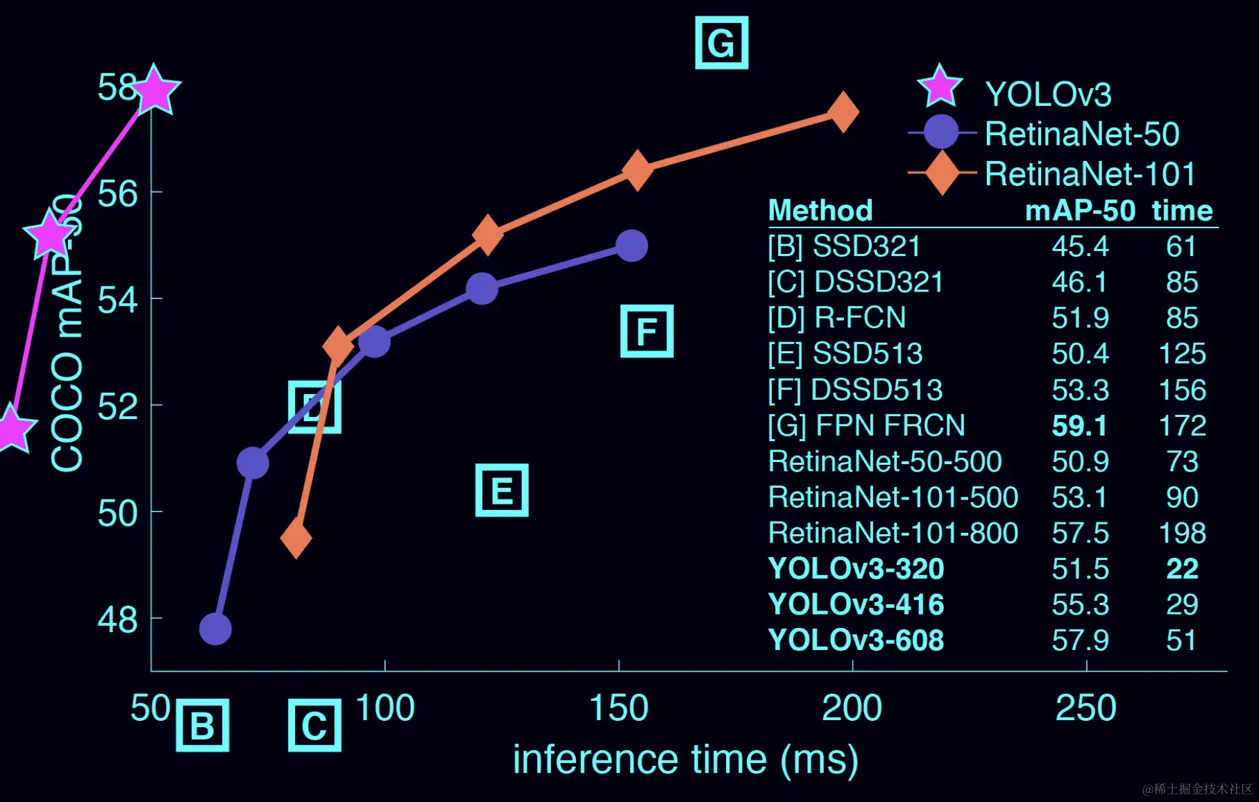 这是一张根据mAP和识别时间对各种目标检测算法做的结果统计图,如果单从mAP的角度看,最好的选择是FPN FRCN,但是交互时间却能达到172ms;如果看YOLOv3,mAP是57.9,交互时间只有51ms。所以我们的识别算法选用YOLOv3。