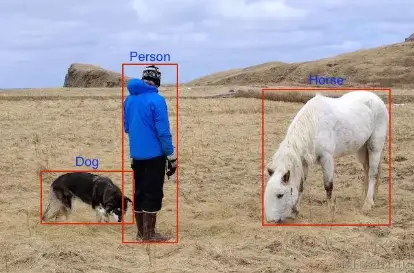 目标检测算法的预测结果应该包含:图像、图像中的目标类别、以及每个目标的边框位置。我们用这个结构的数据和验证集的数据进行比较,来衡量目标检测的质量。例如:我们给定图片和一些边框、分类名称等解释性文字,如下: