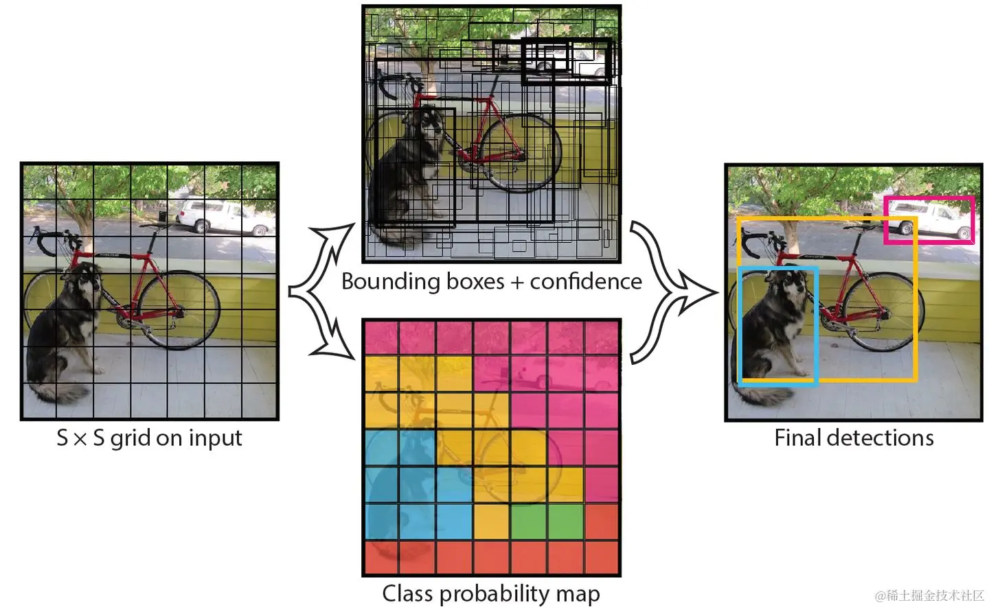 首先将输入图片尺寸调整到448x448,然后送入CNN网络,最后处理网络预测结果得到检测的目标。