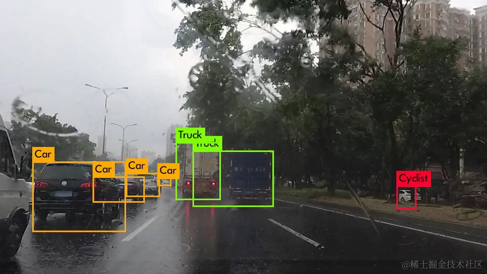 对交通场景中的图片进行目标检测,要能识别出指定的6个类别物品在图中的位置。比如要识别下图中的小汽车、行人、自行车、卡车等。