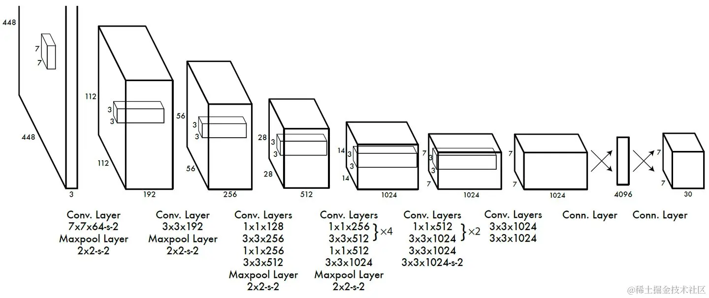 在训练之前,先在ImageNet上进行了预训练,其预训练的分类模型采用上图中前20个卷积层,然后添加一个average-pool层和全连接层。预训练之后,在预训练得到的20层卷积层之上加上随机初始化的4个卷积层和2个全连接层。由于检测任务一般需要更高清的图片,所以将网络的输入从224x224增加到了448x448。如图所示: