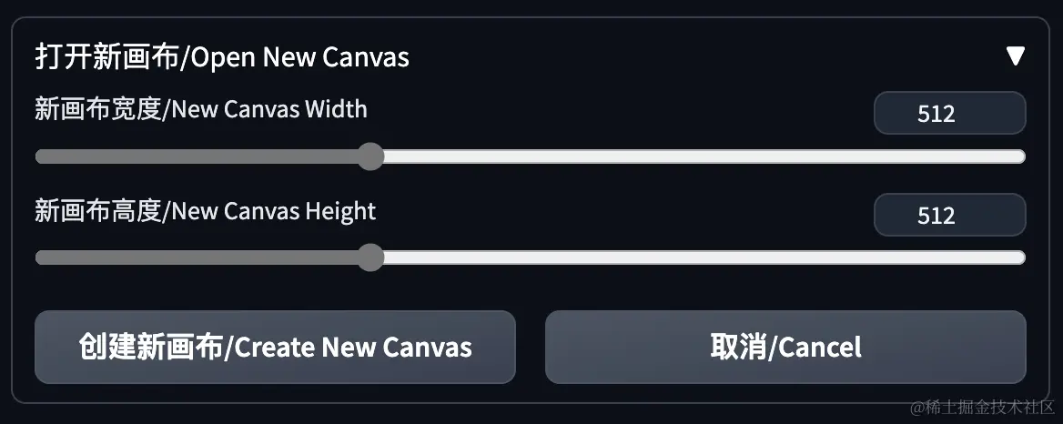 点击这个按钮后,首先会显示创建画布的参数,设置宽高,点击“创建新画布”。