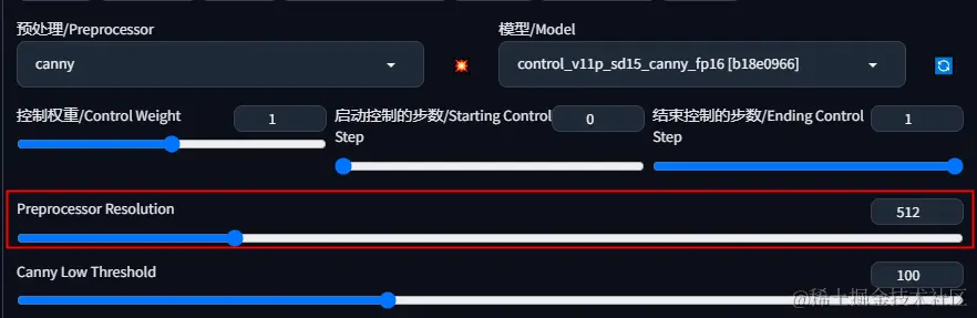 - Canny Low Threshold:去掉过细的线段。大于低阈值的线段被认定为边缘。