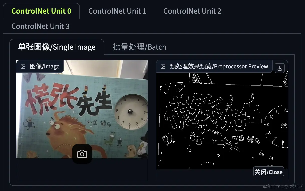 1、ControlNet 模块的标题。如图所示,ControlNet 文字后跟一个版本号,“1 unit”表示当前启用了1个 ControlNet 单元。