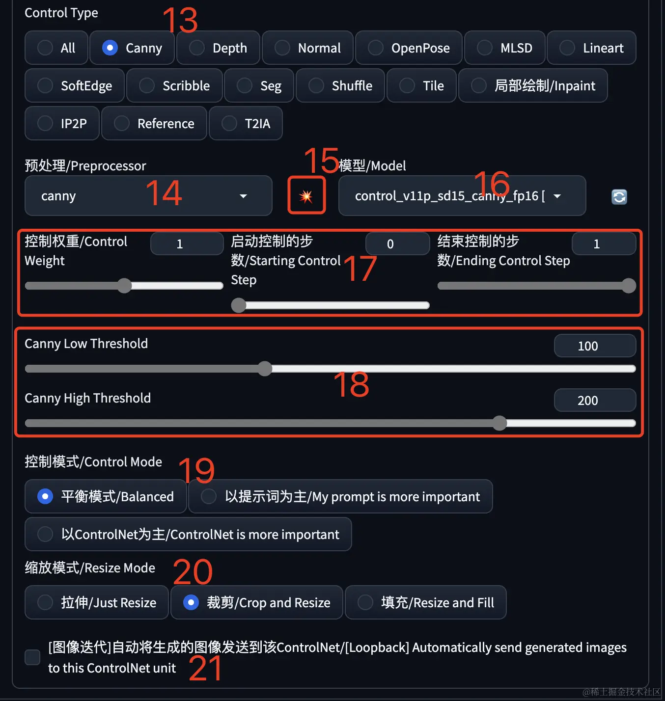 19、控制模式:ControlNet 的通用设置,以提示词为主,还是以 ControlNet 为主,默认是平衡模式。