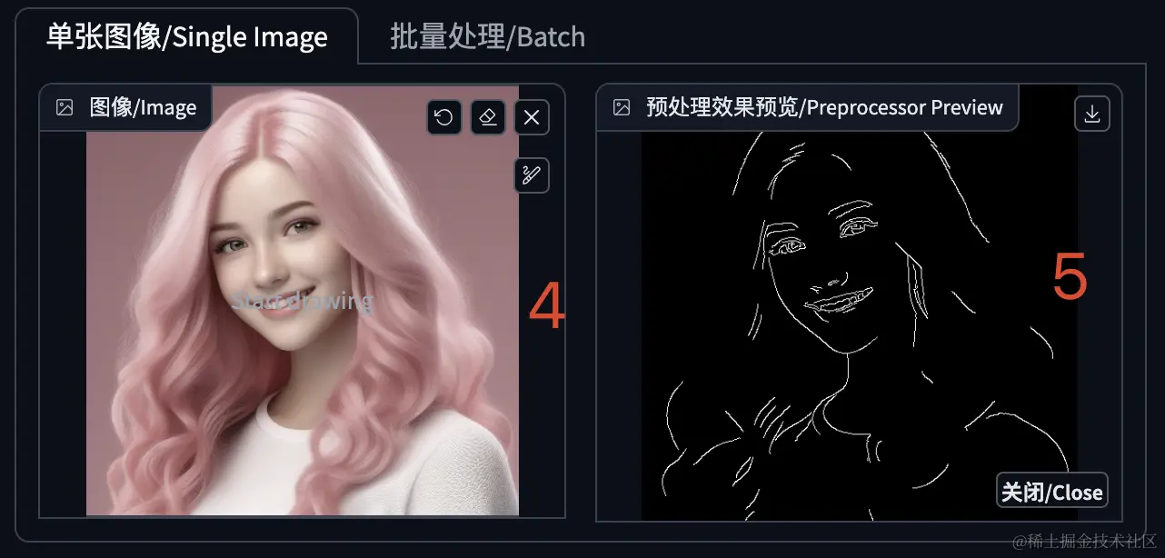 11、允许预览:勾选这个后,会在参考图的右侧出现一个预处理效果预览区域,也就是序号5这个位置。有了这个预览效果,我们就可以快速的了解各个预处理器的能力。这个效果预览不是上传参考图就自动出现的,下面会介绍生成这张预览图的方法。