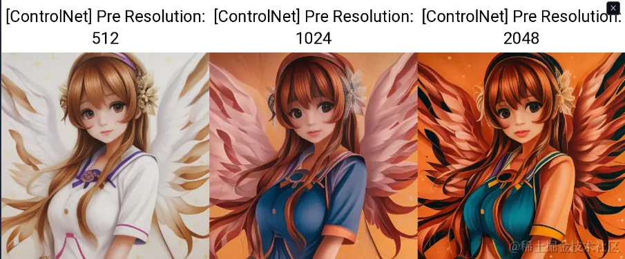 10、完美匹配像素:勾选此项后,无需手动设置某些预处理器生成预览图的分辨率参数,ControlNet 将自动计算,更好的匹配 Stable Diffusion。建议勾选,不同的值,对出图还是有些影响的。以Canny为例: