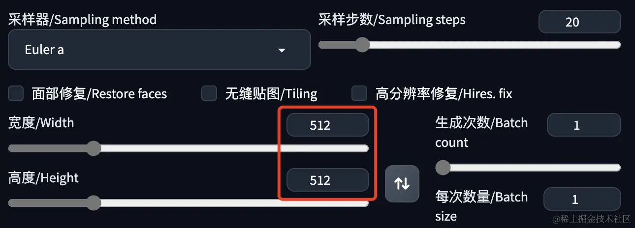 点击这个箭头按钮会把参考图的尺寸填写到 Stable Diffusion 的画布尺寸中,也就是填写到下图的位置: