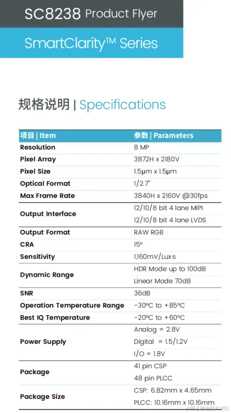 通过CMOS图像传感器感受环境光,输出图像供我们分析,通过sensor宣传册了解一下sensor性能和情况。下图以斯特威SC8238为例。