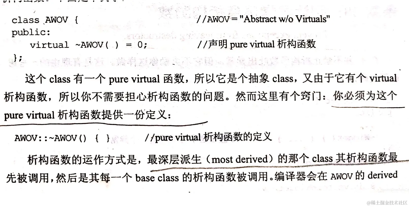 和构造函数类似,析构函数也不能被继承。与构造函数不同的是,在派生类的析构函数中不用显式地调用基类的析构函数,因为每个类只有一个析构函数,编译器知道如何选择,无需程序员干涉。