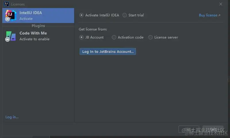IDEA 运行成功后,会弹出如下对号框,强制用户需要先登录 JetBrains 账户才能使用: