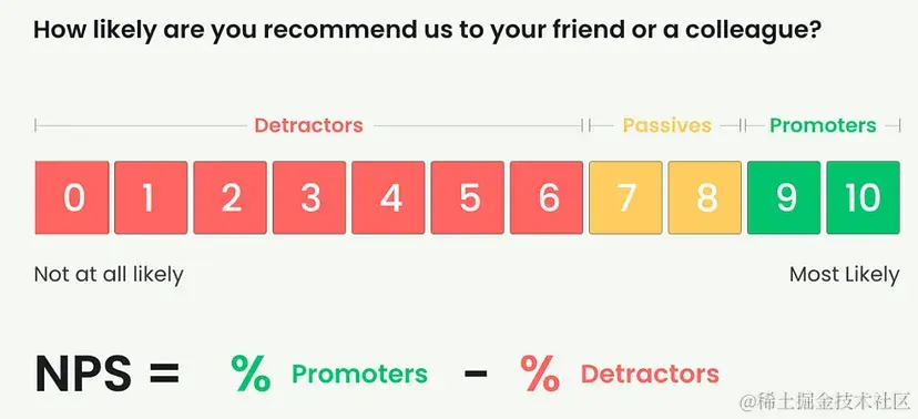 净推荐值是推荐者和诋毁者之间差异的百分比分数。顾客被要求给出一个从1到10的分数,表示他们向其他人推荐产品的可能性有多大。9分和10分是积极者,8分和9分是被动者,6分及以下是诋毁者。NPS可以说是所有指标中最重要的,因为客户是决定团队是否交付了任何有价值的东西的最佳利益相关者。
