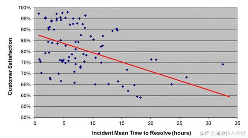 缺陷解决时间(DRT, Defect Resolution Time)或平均解决时间(MTTR, Mean Time To Resolution)是开发团队解决缺陷所需的平均时间,越短越好。平均DRT或MTTR通常跟踪所有环境中的缺陷。DRT的SLA因组织和团队而异,一般来说,团队应该将最大DRT的目标定为关键缺陷1天,高缺陷1-2天,中等缺陷5-7天,低缺陷10-14天。MTTR与客户满意度呈负相关,因此很重要。
